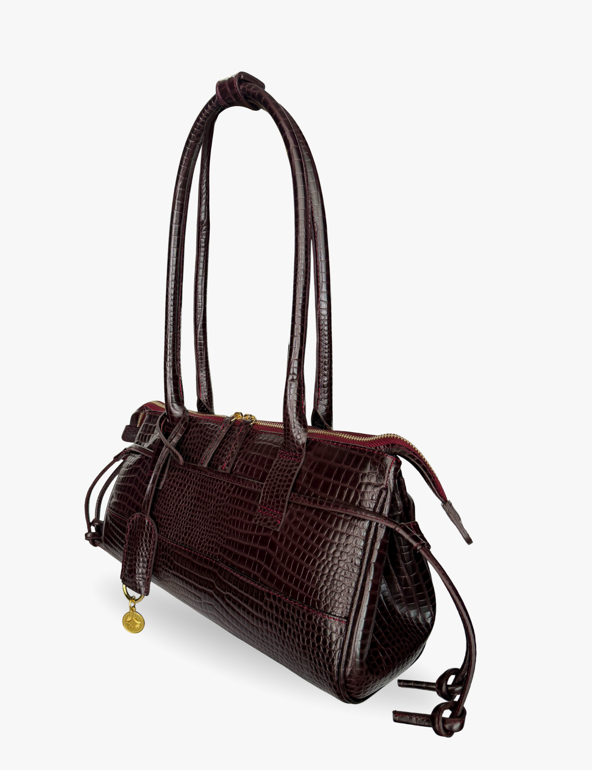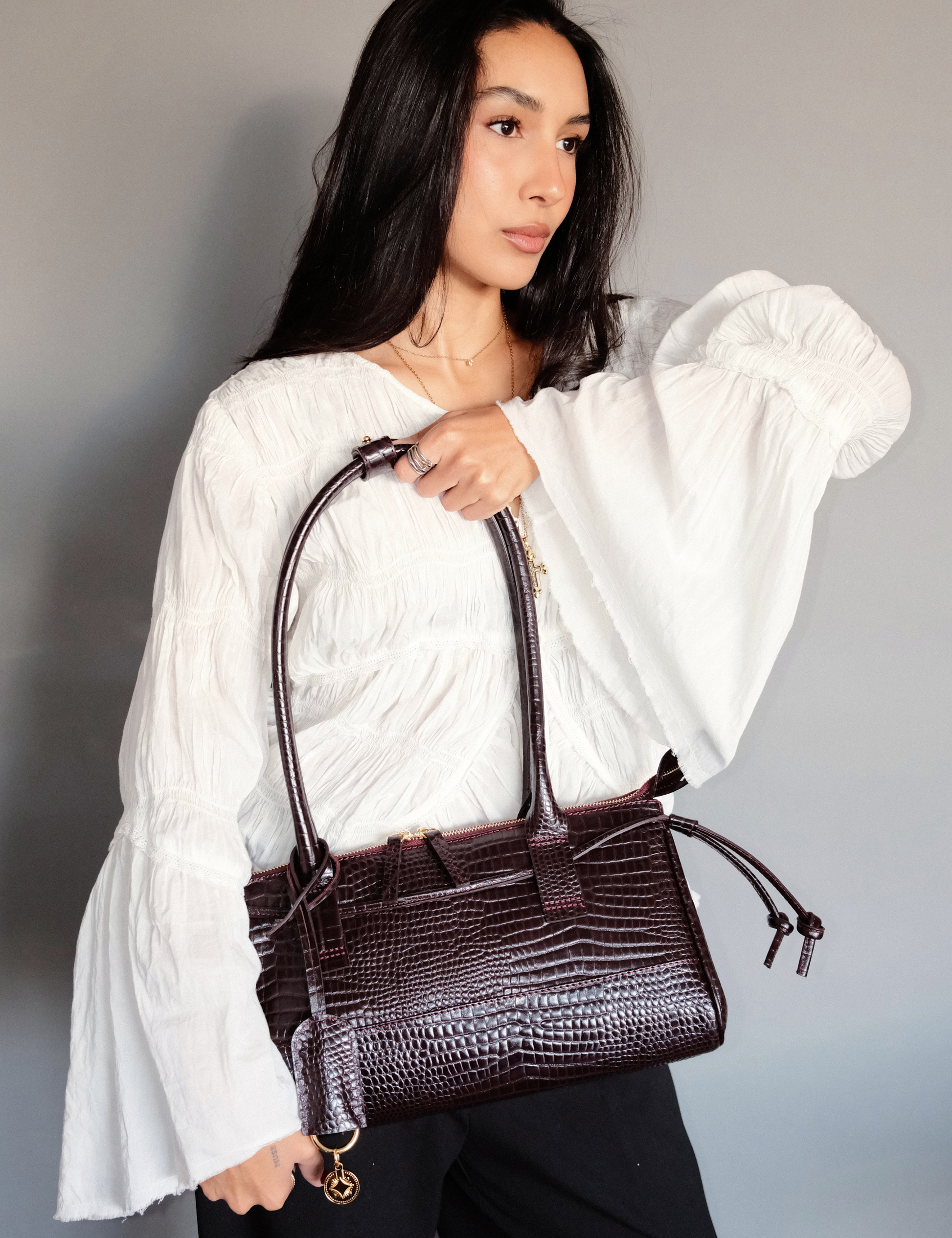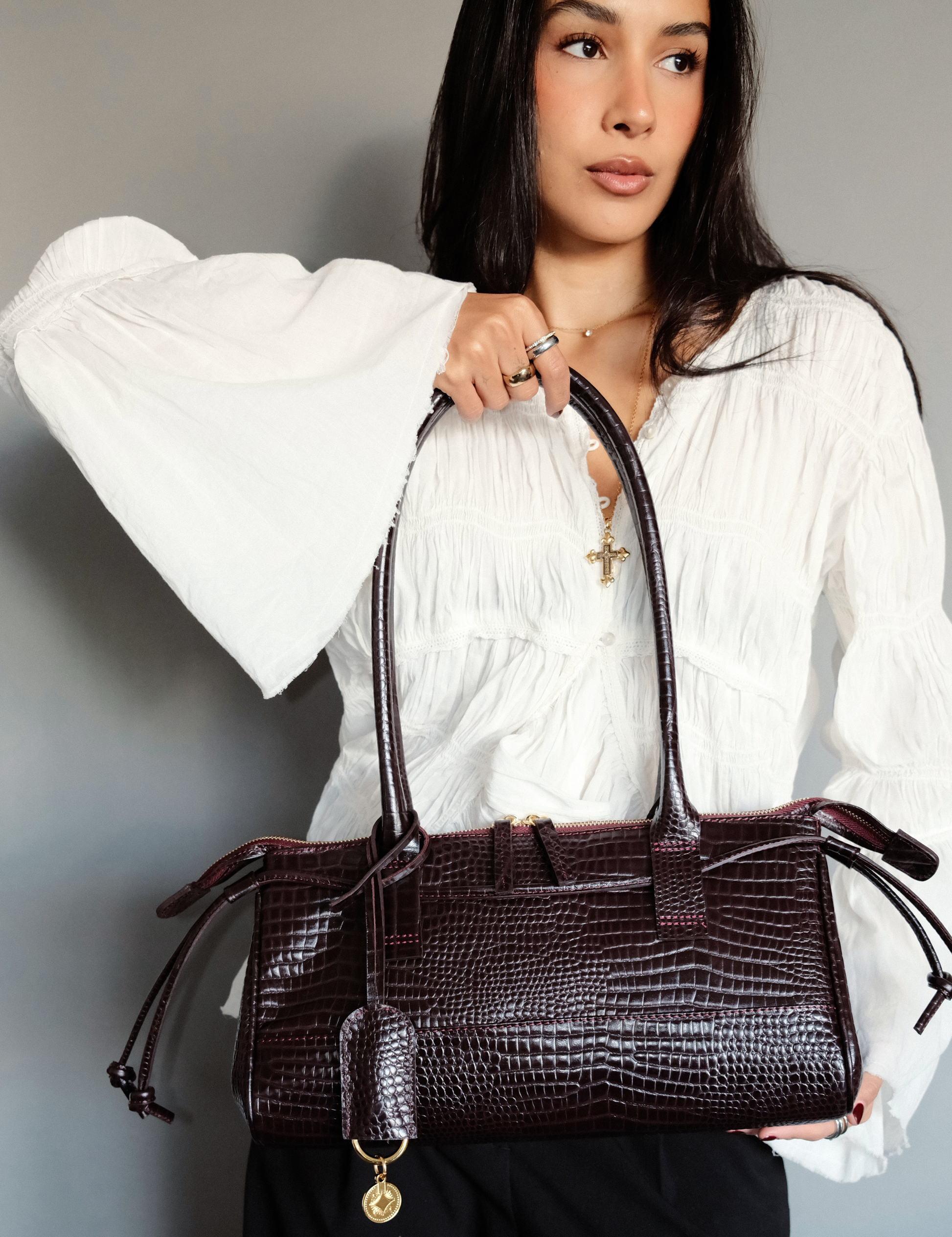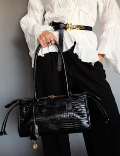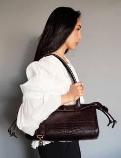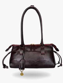 An east west silhouette that rests effortlessly on the shoulder, sleek, elongated, and confident. Crafted in lizard-t...