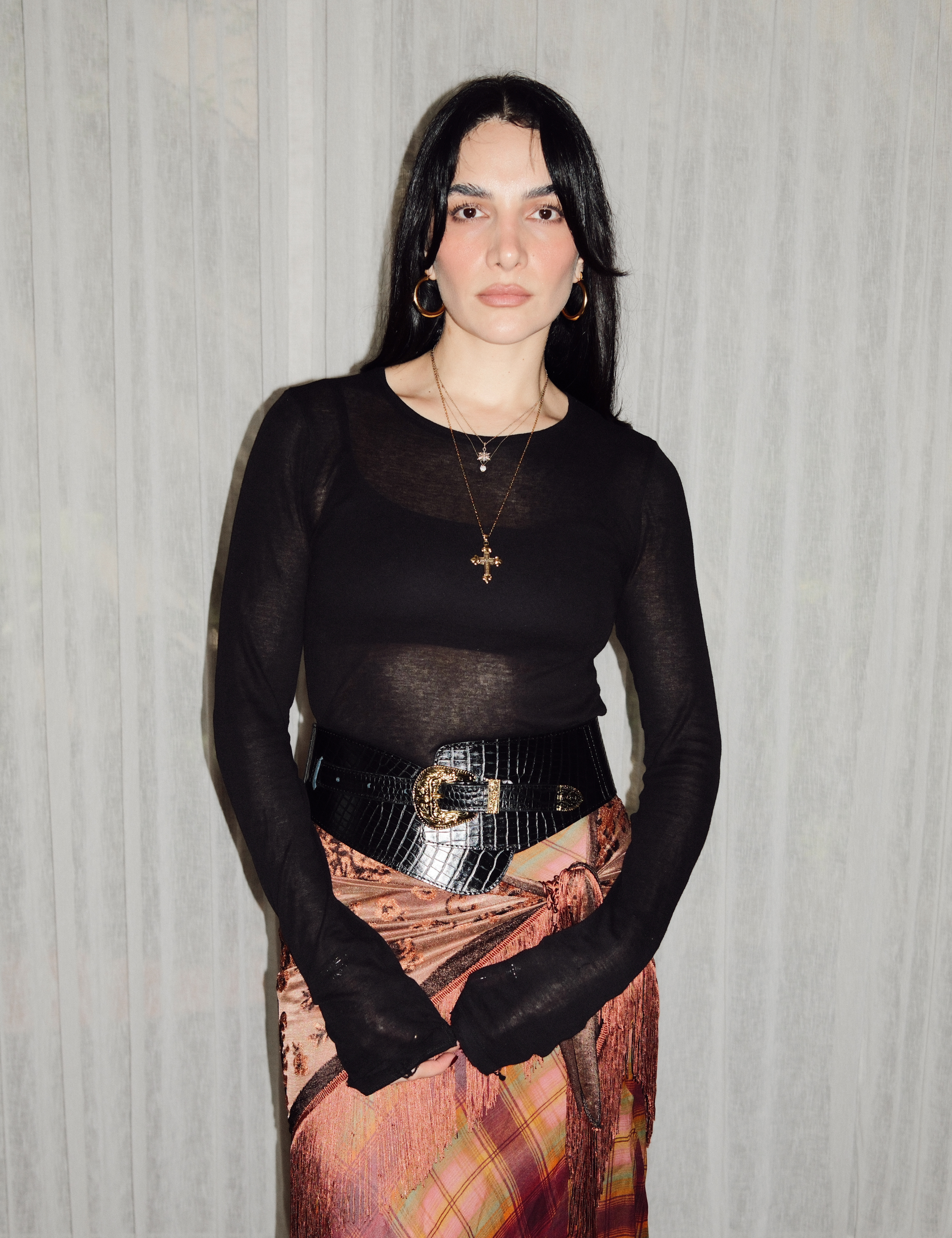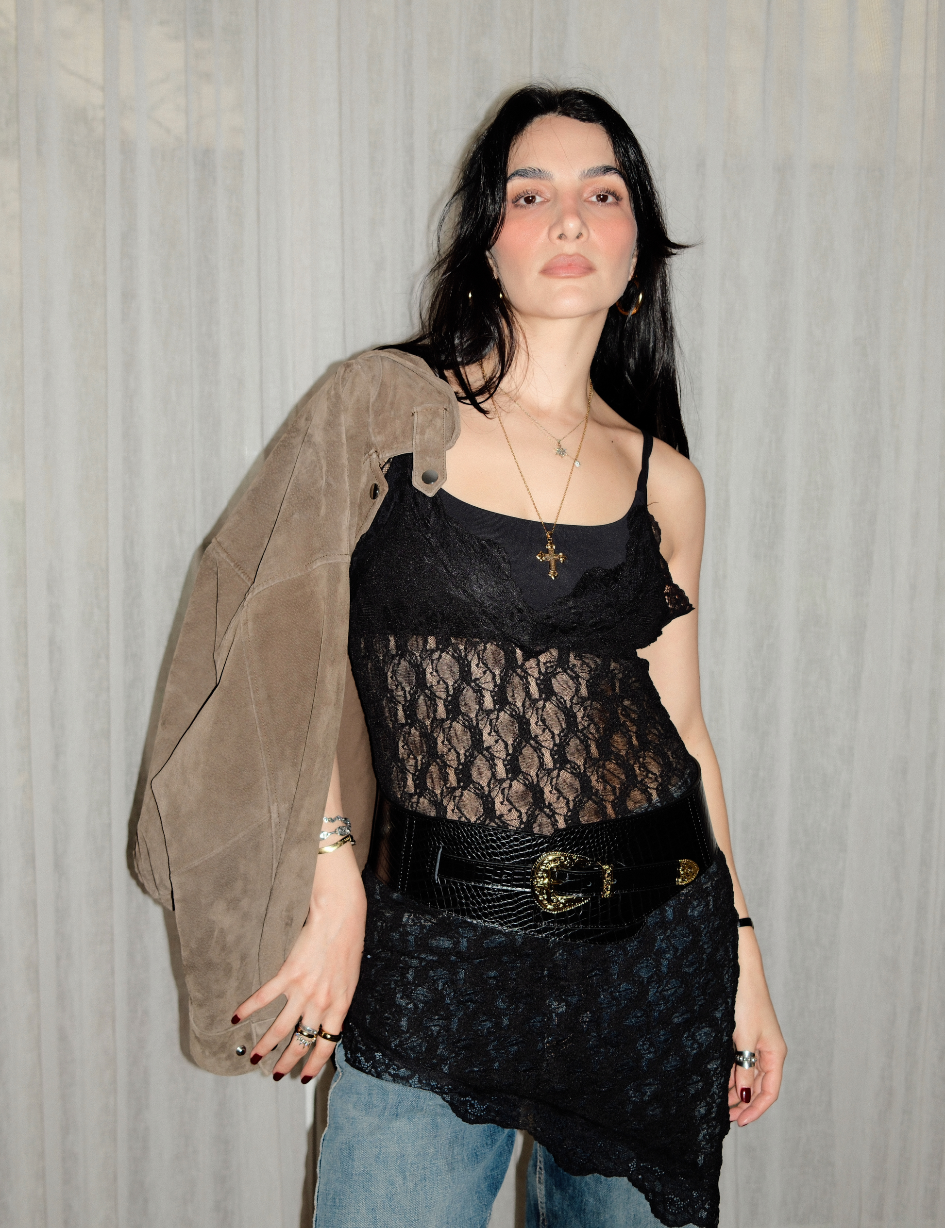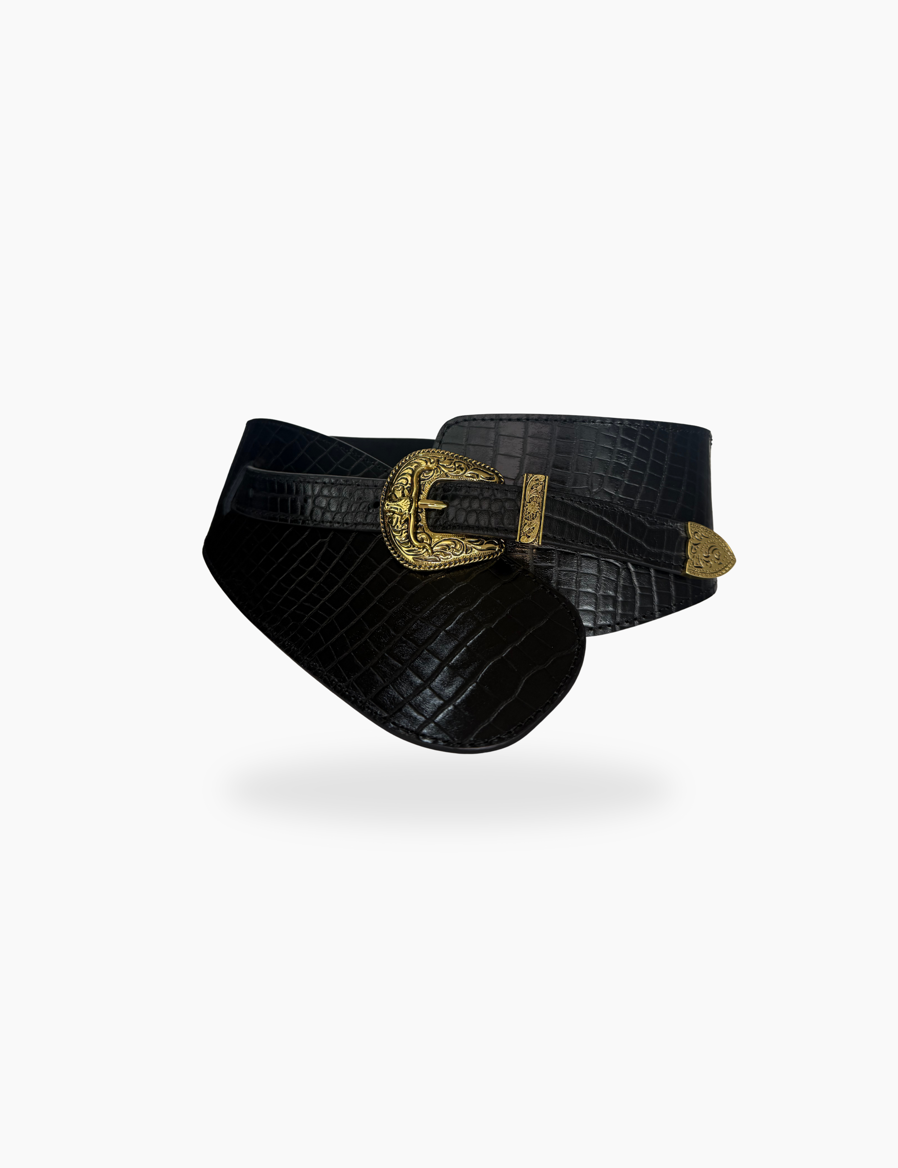 A modern ode to western glamour. Crafted in lizard-textured leather and finished with a sculpted mini western buckle in antique gold, this belt elevates every silhouette, from waist-cinched looks to relaxed hip styling.