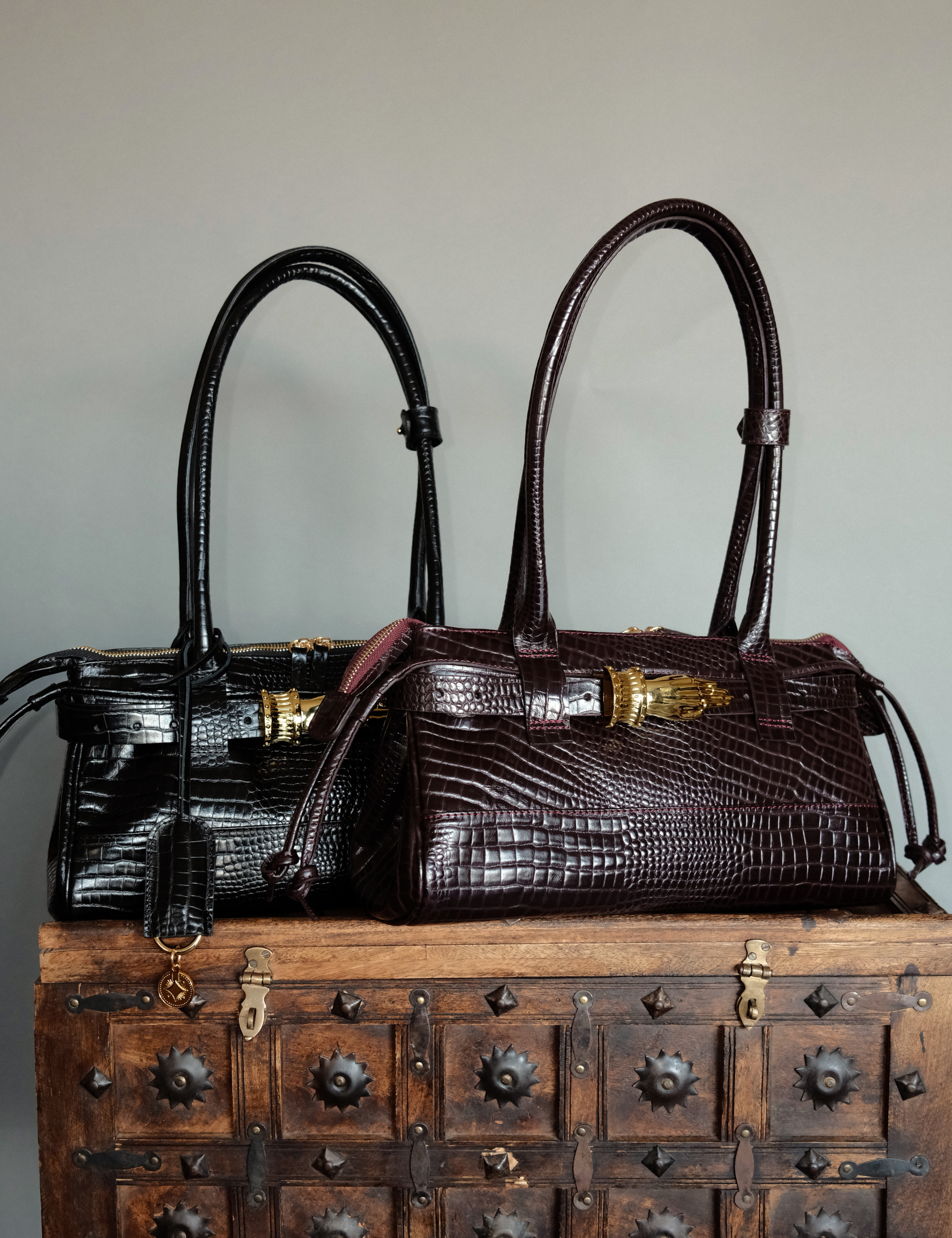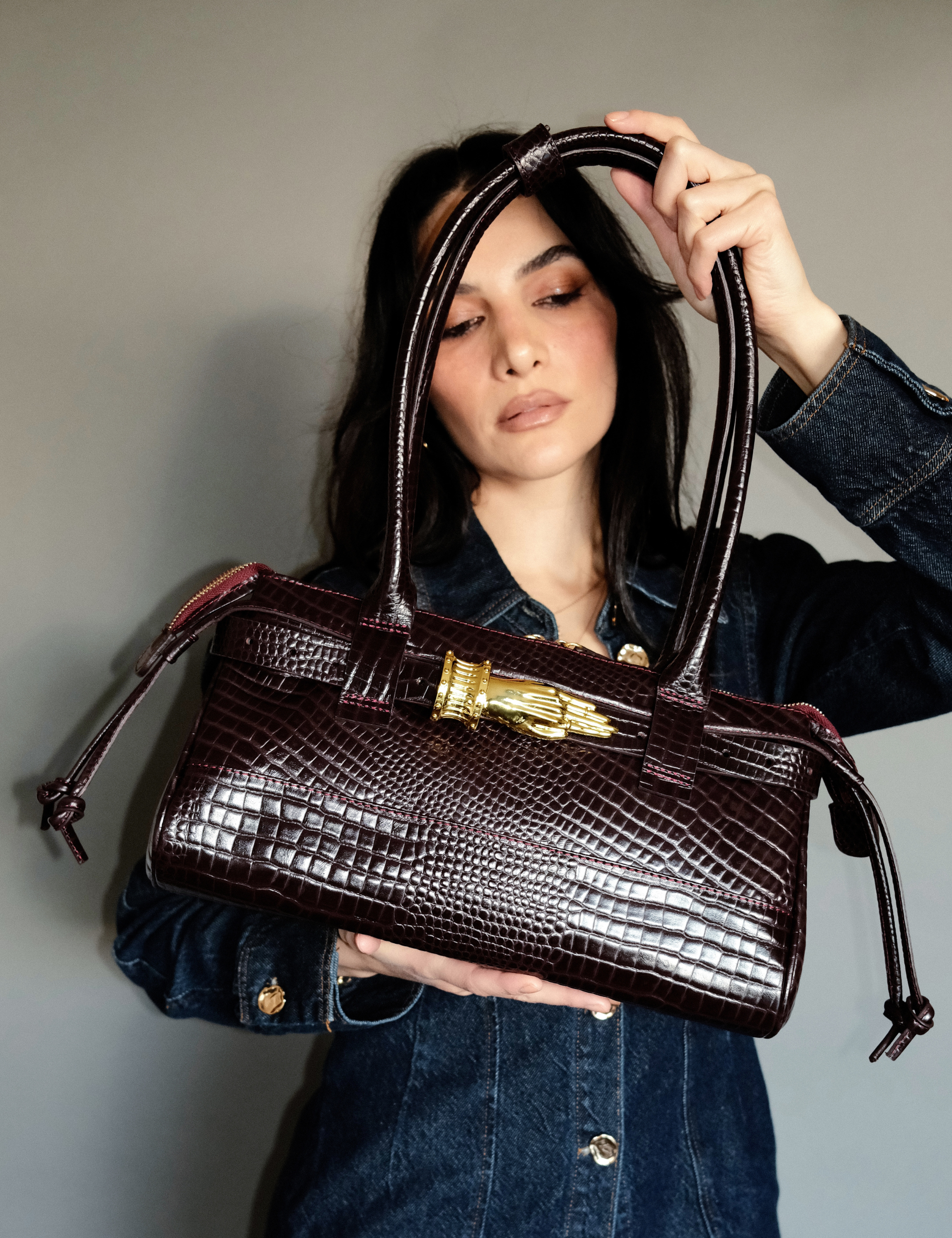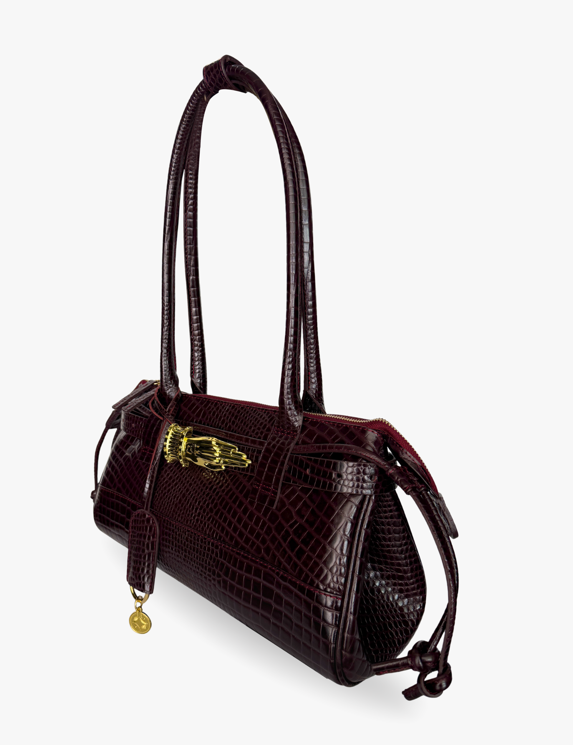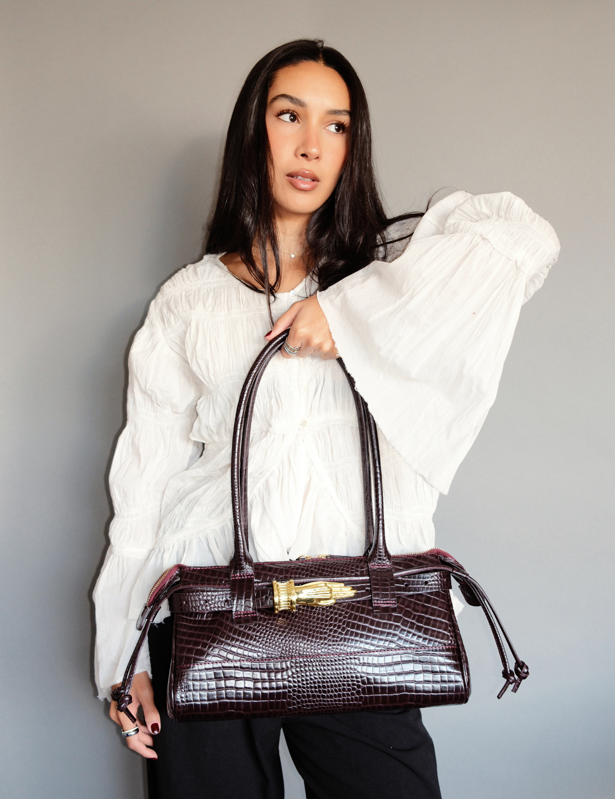 This version includes the Gilded Lure Belt , featuring intricate hand-shaped hardware inspired by the art of palm reading. Designed to draw the eye and spark quiet fascination. Sculptural yet fluid, it balances adornment and ease, meant to be worn with intention but never tied to a single mood. Versatile and refined, the East West Gilded Lure Bag moves effortlessly from day to night, from simplicity to allure.