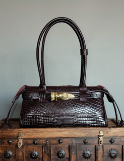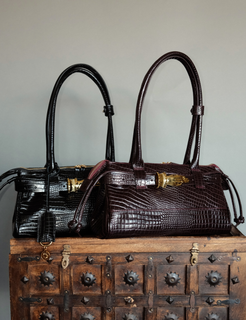 An east west silhouette that rests effortlessly on the shoulder, sleek, elongated, and confident. Crafted in lizard...