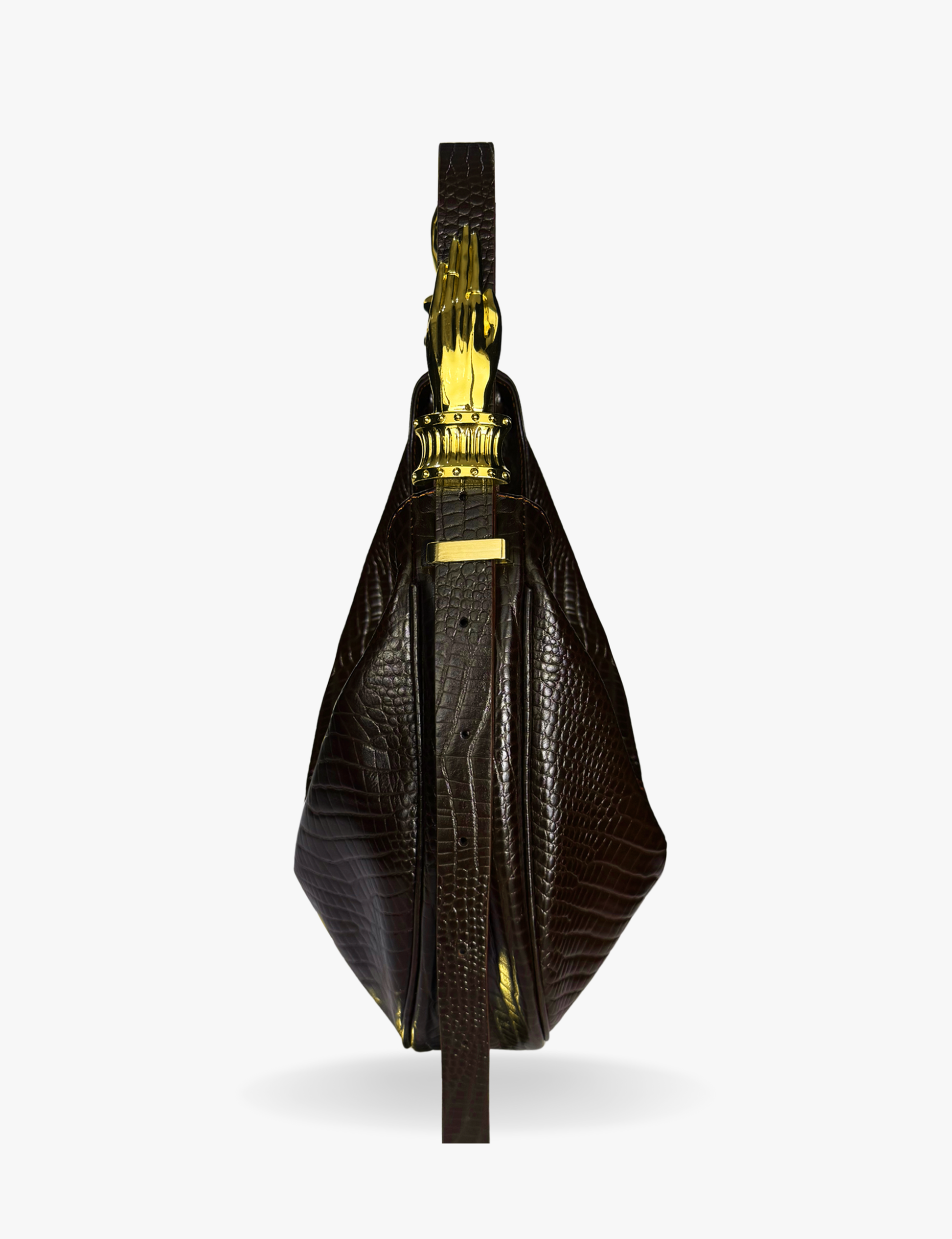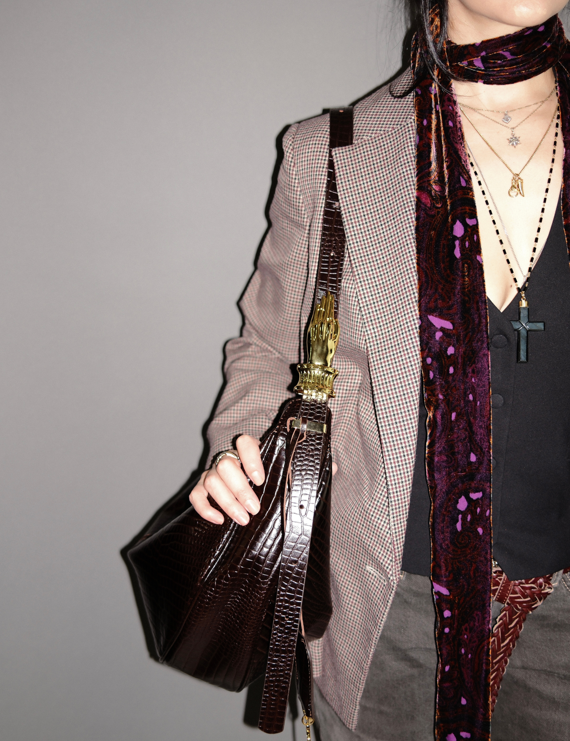 With its relaxed silhouette and a touch of bohemian flair, this slouchy bag is ideal for those who appreciate fashion with a carefree air. Crafted from the highest quality leather, it is not only spacious and practical, but also a timeless piece that complements any style. The intricate and alluring hand-shaped hardware is inspired by palm reading and will surely captivate the imaginations of all who behold it.