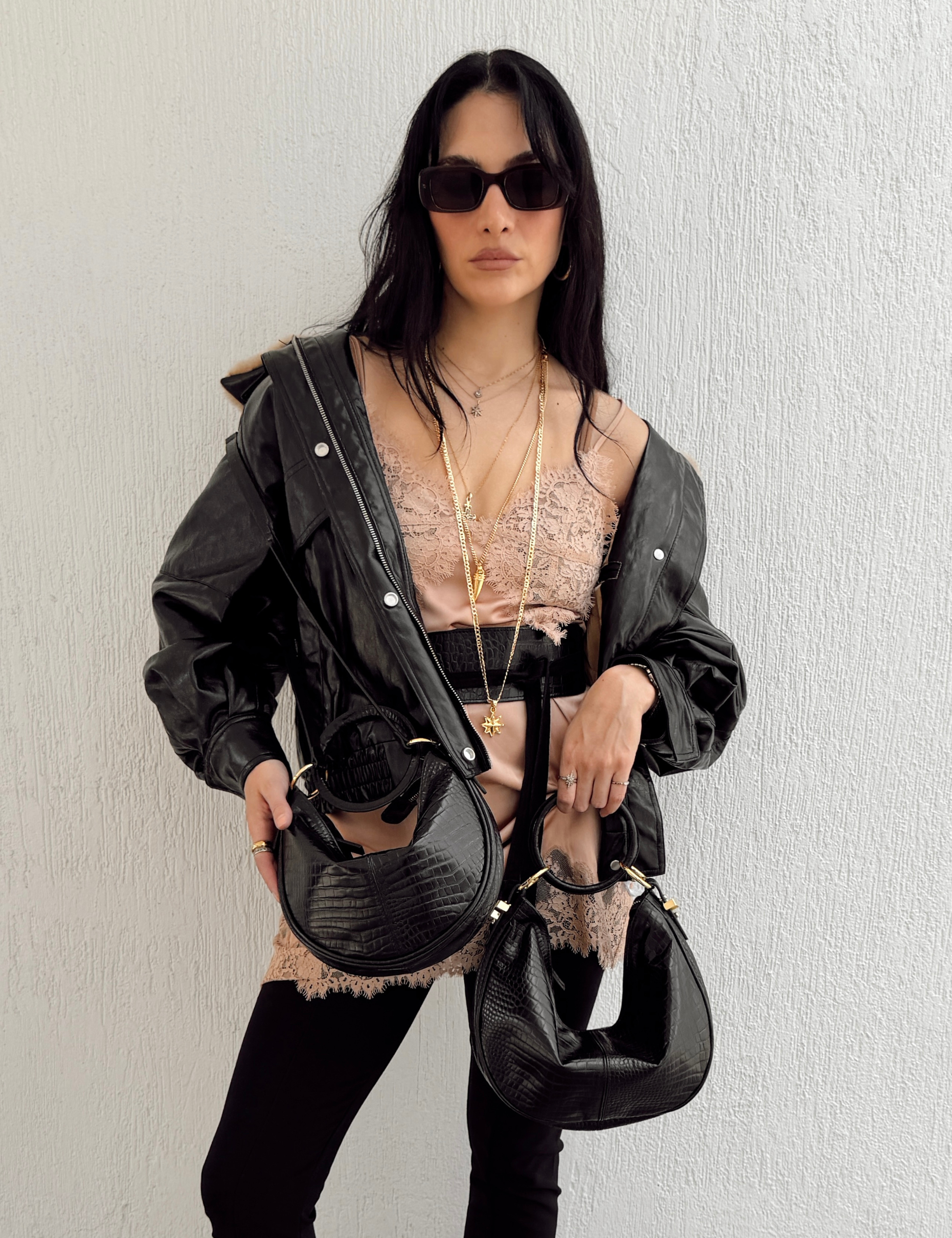 A new gesture for an icon. Our Hobo now features a sculptural 10 cm leather-wrapped ring, anchored by 3 golden rings for a fluid, seamless connection. Designed to be carried as a handbag, it can also be paired with its long strap for an easy crossbody moment. The large ring is fully removable.