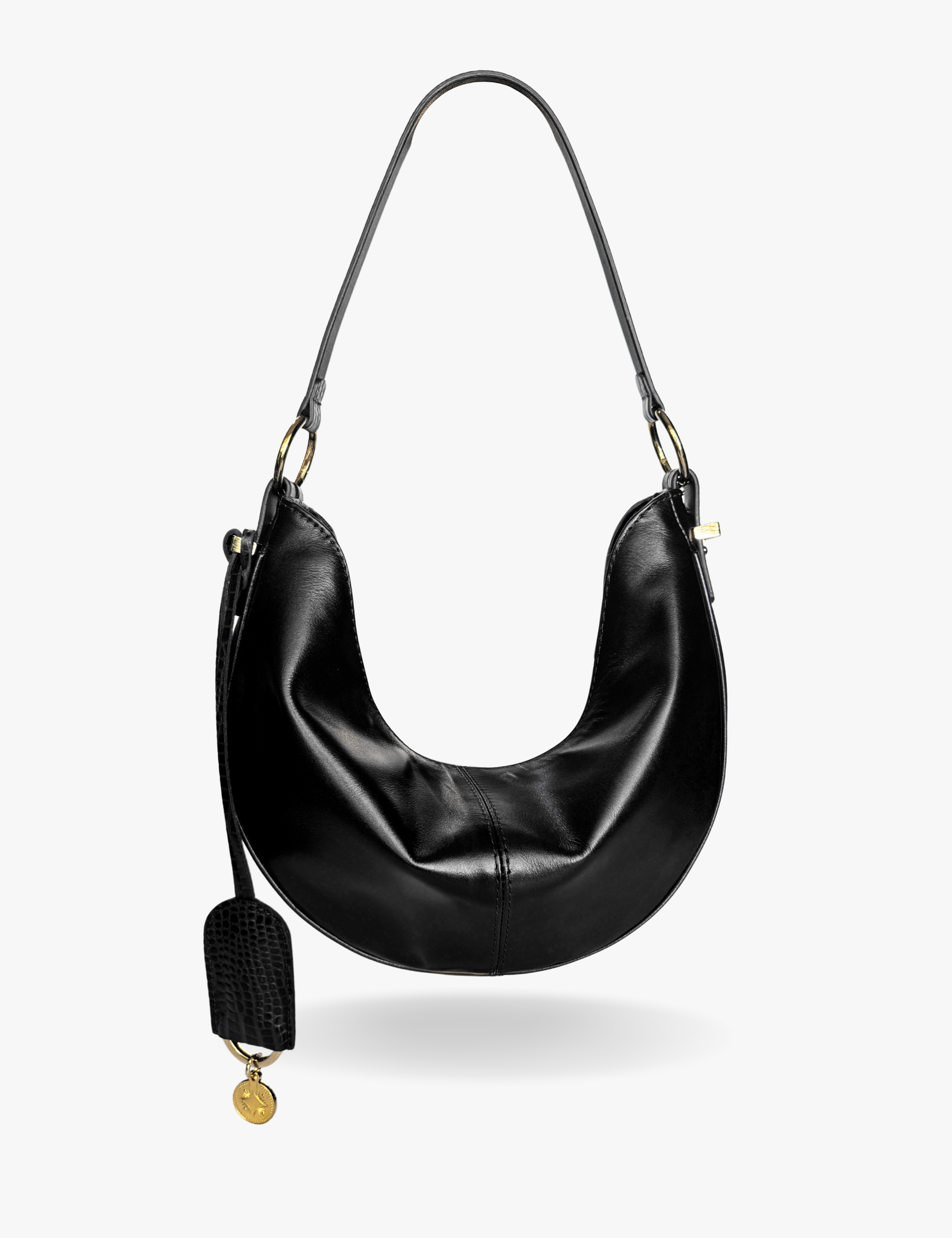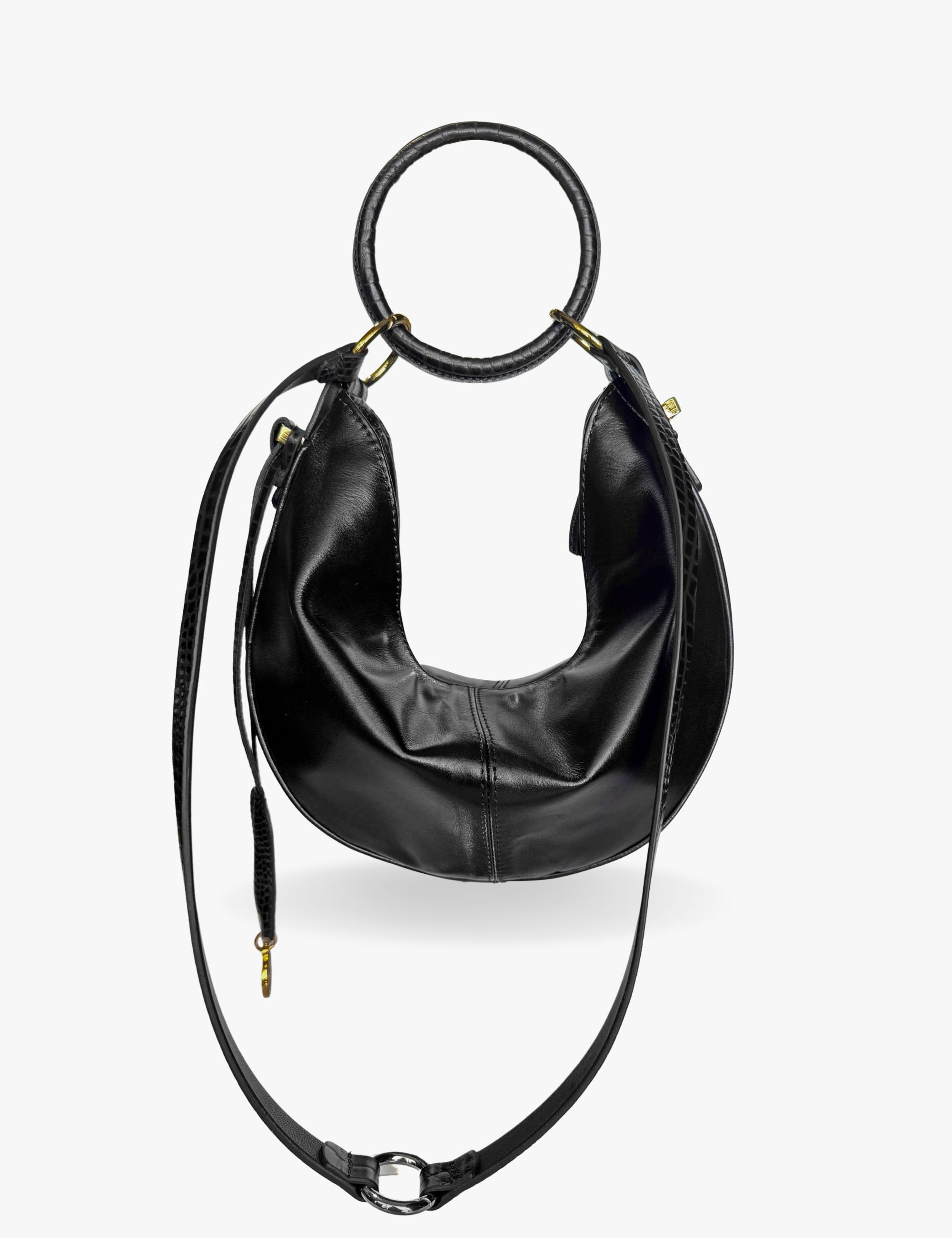 A new gesture for an icon. Our Hobo now features a sculptural 10 cm leather-wrapped ring, anchored by 3 golden rings for a fluid, seamless connection. Designed to be carried as a handbag, it can also be paired with its long strap for an easy crossbody moment. The large ring is fully removable.
